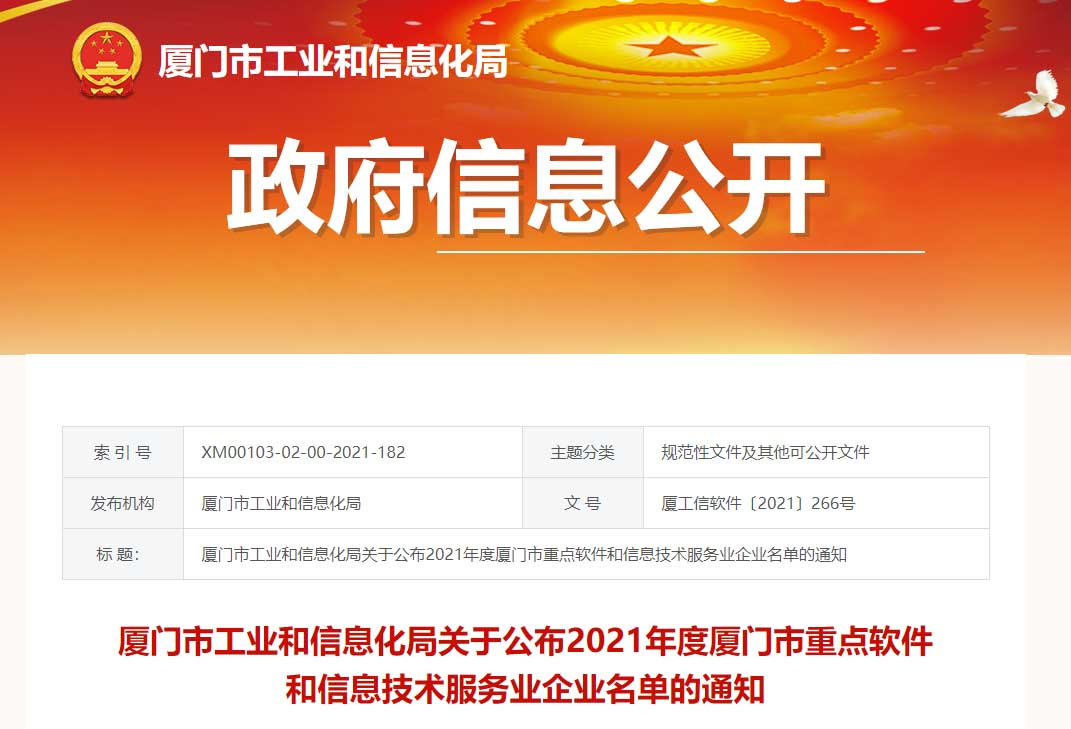 近日,廈門市工業和信息化局經過公示后,發布了2021年度“廈門市重點軟件和信息技術服務企業”名單,我司成功獲選“2021年度廈門市重點軟件和信息技術服務企業”稱號!